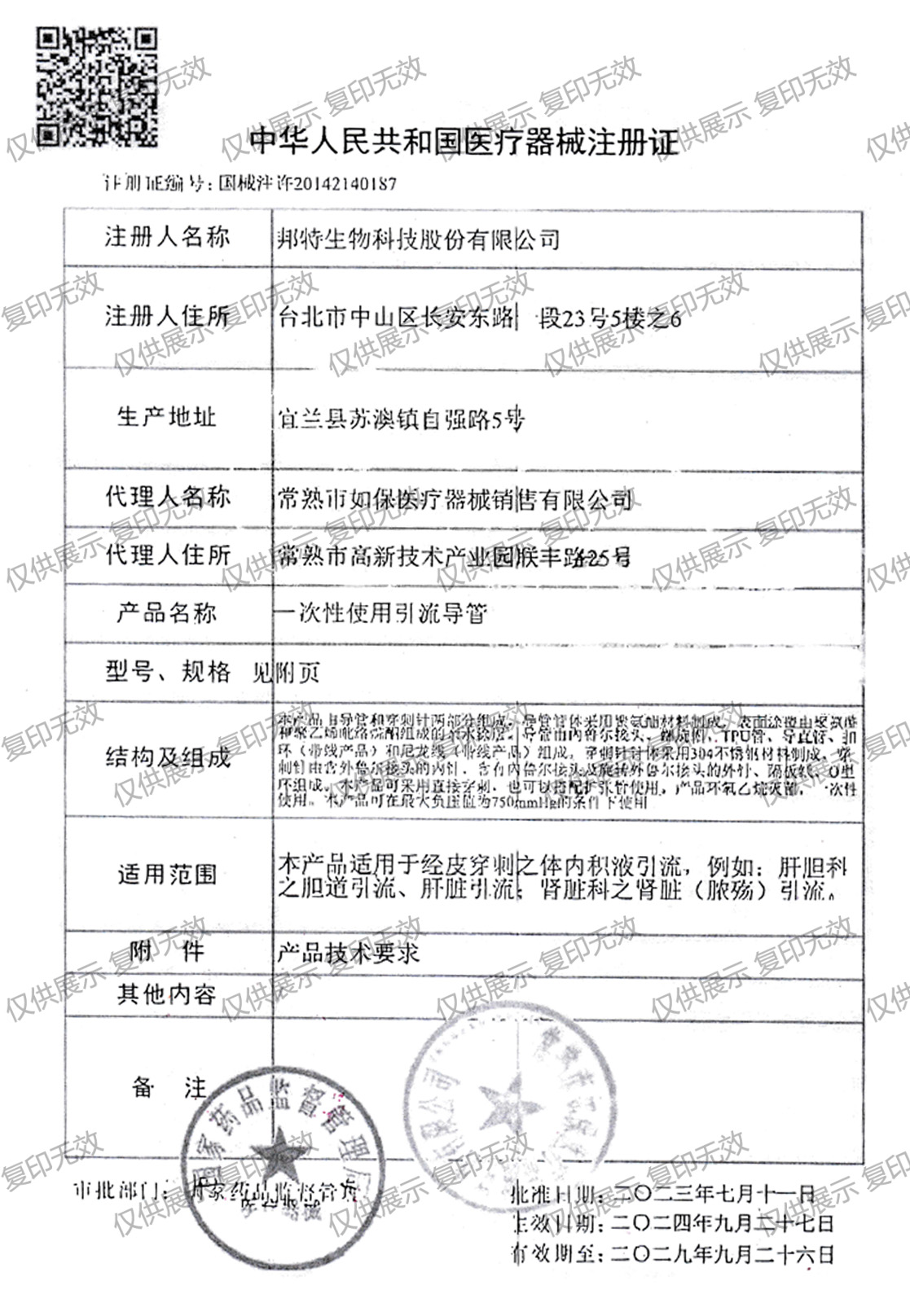 適用范圍:本產(chǎn)品適用于經(jīng)皮穿刺之體內(nèi)積液引流,例如:肝膽科之膽道引流、肝臟引流;腎臟科之腎臟(膿殤)引流。