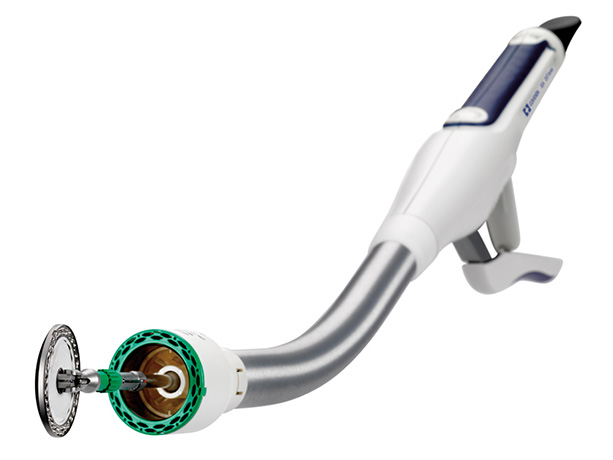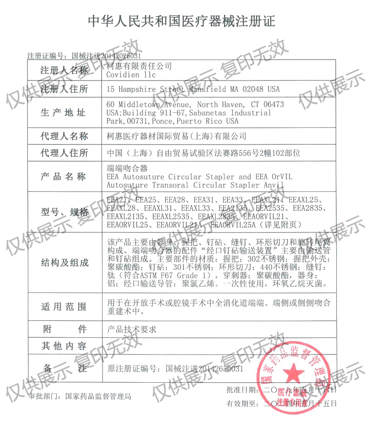 結(jié)構(gòu)及組成:該產(chǎn)品主要由器身、握把、釘砧、縫釘、環(huán)形切刀和旋轉(zhuǎn)尾翼構(gòu)成。端端吻合器的配件“經(jīng)口釘砧輸送裝置“主要由輸送管和釘砧組成。一次性使用。